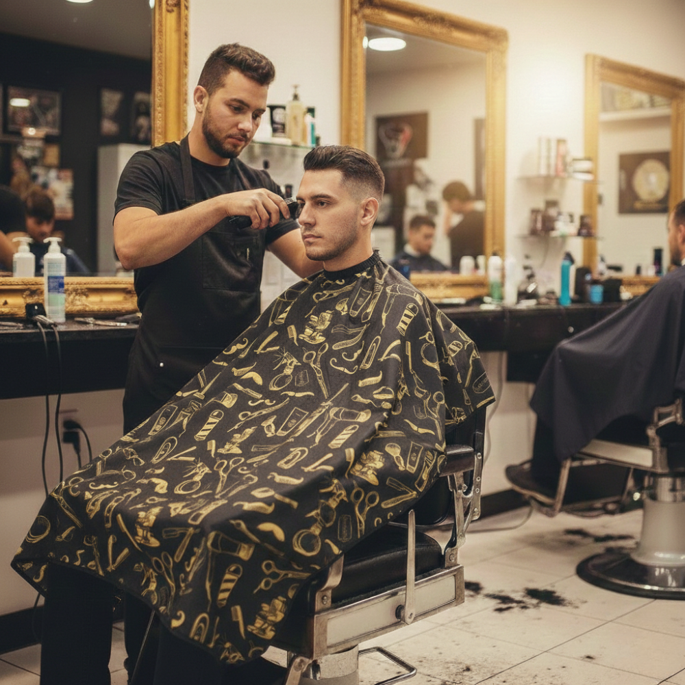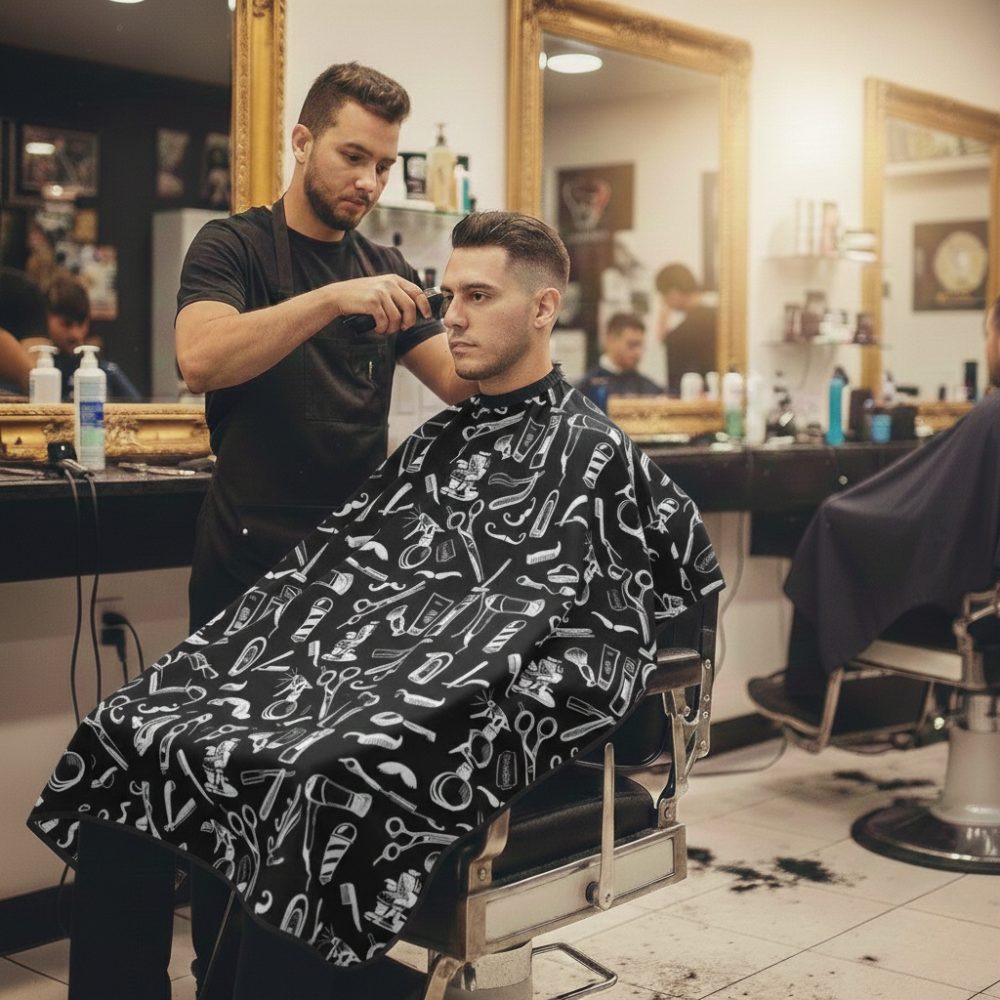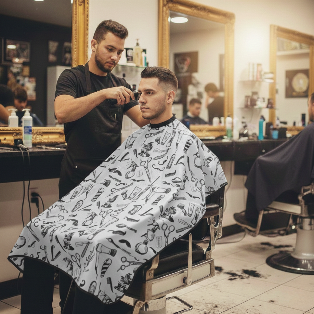 Bring a touch of barbershop nostalgia to your salon or home with the Campbell's Antique Styling Cloth. This stylish cloth features a classic pattern showcasing vintage barber tools, tonics, and combs, creating a unique atmosphere for haircuts and styling.